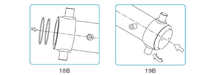 裝好一個(gè)缸筒后,將缸筒繼續(xù)向前推并將卡簧裝入上一節(jié)缸筒內(nèi)壁上對應(yīng)的卡簧