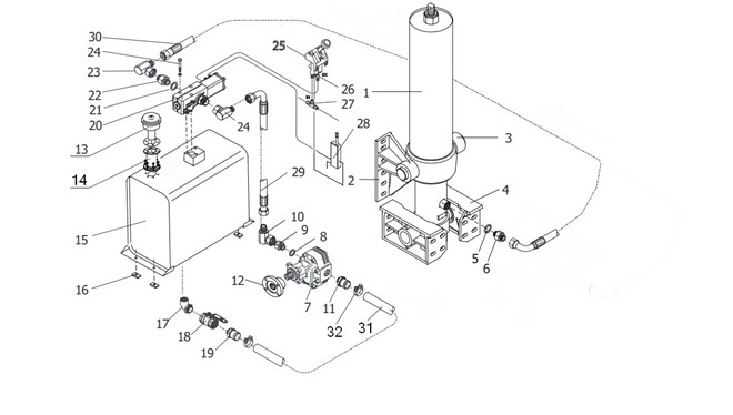 請(qǐng)按照上圖用油管和氣管將全部液壓元件連接進(jìn)來。確保油管(軟管)長(zhǎng)度足夠長(zhǎng),以免在舉升過程妨礙油缸的運(yùn)動(dòng)。組裝完成后沒有必要立即將氣體從油缸中排出,因?yàn)橥ㄟ^最初的幾" />